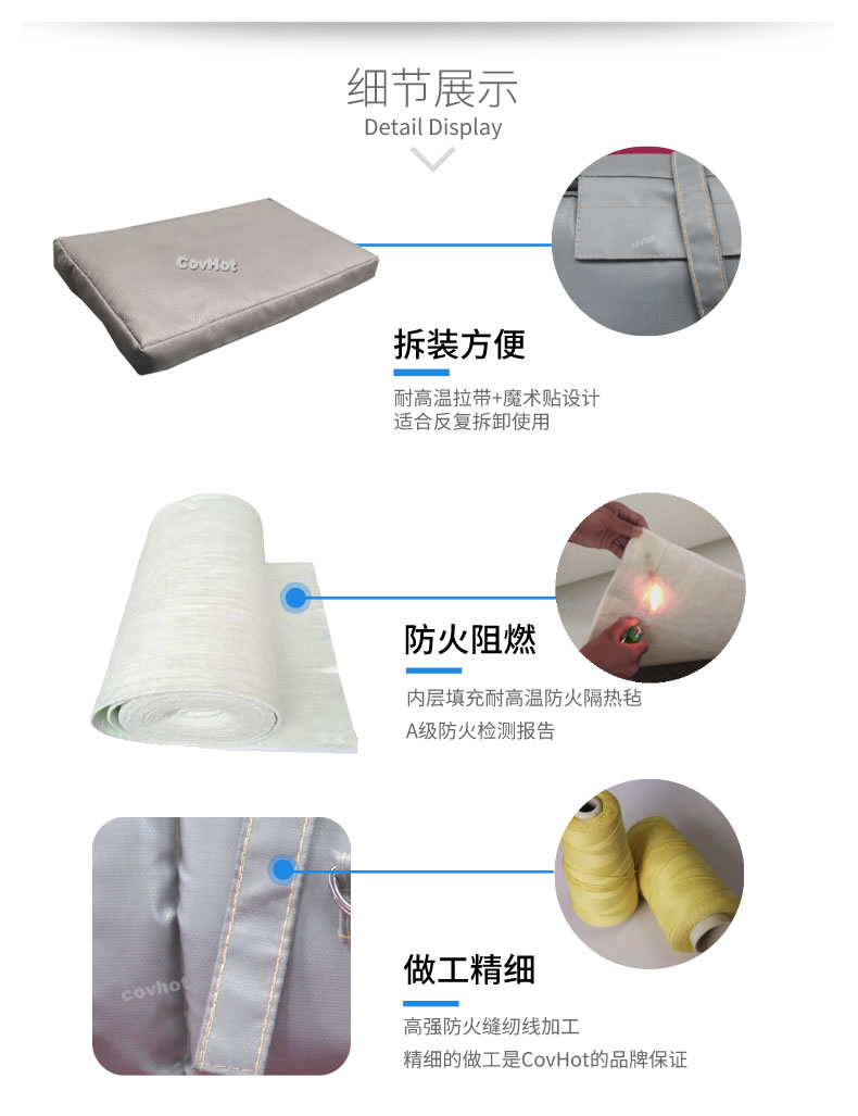 可拆式保溫套保溫效果好,拆裝方便,易于日常維護(hù)保養(yǎng),能反復(fù)使用,對(duì)環(huán)境無污染,與人體接觸后不刺激皮膚。根據(jù)現(xiàn)場的物料產(chǎn)生火災(zāi)的可能性、火災(zāi)的預(yù)期溫度、救火需要的時(shí)間等綜合考慮,設(shè)計(jì)適應(yīng)不同的溫度、耐火時(shí)間,從而達(dá)到經(jīng)濟(jì)、合適的防火效果。